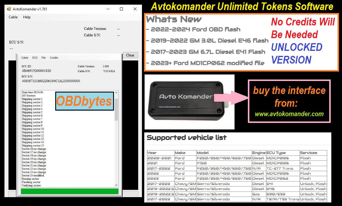 The AvtoKomander supports various Ford Powerstroke, GM Duramax, and potentially other vehicles by allowing the unlocking and tuning of specific Electronic Control Units (ECUs). Key supported vehicles include Ford 6.7L Powerstroke engines from around 2020-2022, GM 3.0L Duramax (LM2/LZ0) and 2.8L Duramax engines from 2016-2022, and 2024-2025 L5P Duramax vehicles. For a definitive, up-to-date list of supported vehicles, it is best to check the websites of distributors such as BC Diesel, OCDiesel, or Warranty Killer Performance.
